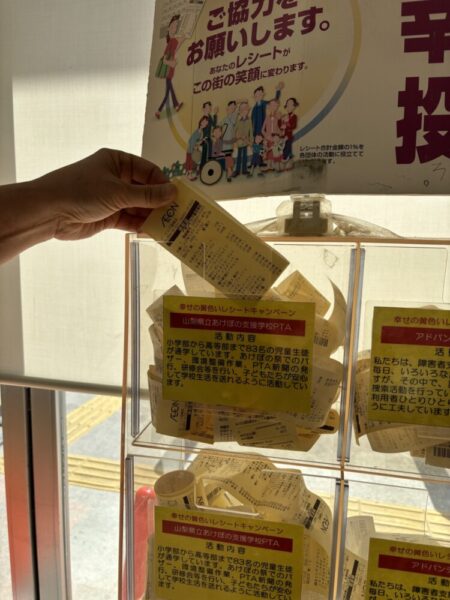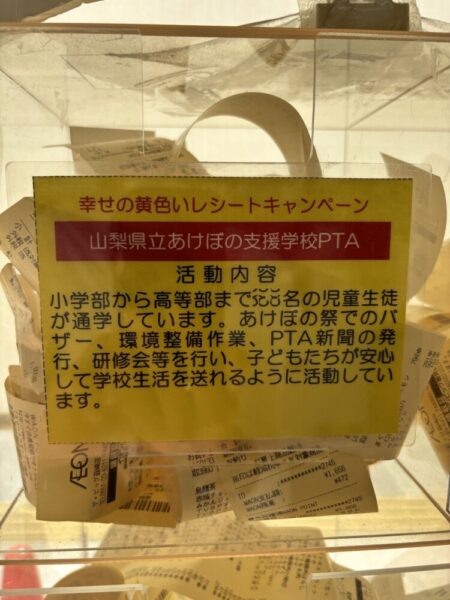 このキャンペーンは、毎月11日「ザ・ビッグ韮崎店」にて買い物をされますと、黄色いレシートが渡され、そのレシートを店内に設置されているBOXの「あけぼの支援学校」へ投函していただきますと、レシートの合計金額の1%に相当する金額を本校に寄付していただけるというものです。