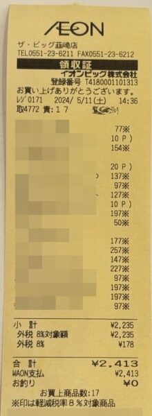 去る5月11日は土曜日で、本校で行われた同窓会役員会に出席した後、早速ザ・ビック韮崎店へ向かい、お茶や大好きなカップ麺、大根の漬物の他、合計2,413円の食料品等を購入し、レシートを本校ボックスに入れてきました。