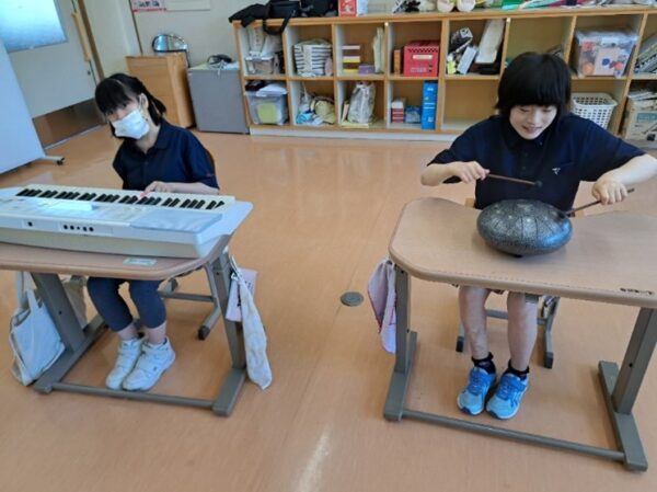 校歌斉唱では中学部の生徒が指揮を執り、学習発表では、高等部の生徒が音楽で練習したキーボードとスチールドラムの演奏を披露してくれました。