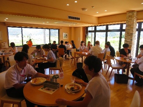まずは社屋内のレストラン「そらのね」でランチをいただきました。働いているのはたいようの利用者さんになります。この日は他の学校の見学とも重なり店内は大盛況。