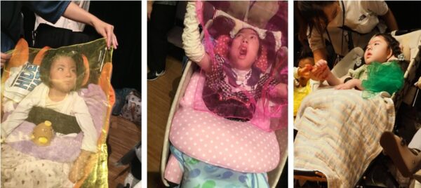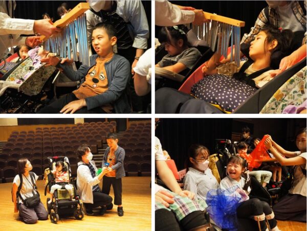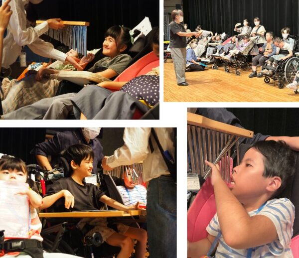 櫛形生涯学習センターに着くと少し休憩し、あやめホールに向かいました。ホールでは加藤篤子先生と一緒に音楽活動を行いました。加藤先生の伴奏に合わせて歌を歌ったり、カラフルなスカーフを振ったり、楽器で合奏もしました。